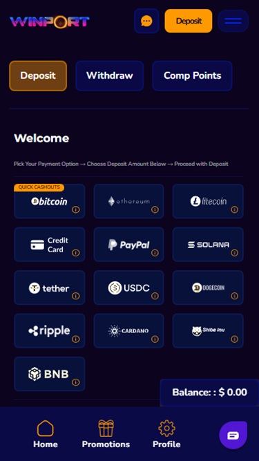 WinPort Casino هو كازينو على الإنترنت يدعم العملات المشفرة، مرخص بموجب قوانين كوراساو وموجه للمقامرين المقيمين في الولايات المتحدة الأمريكية وكندا ونيوزيلندا وأستراليا والمملكة المتحدة.