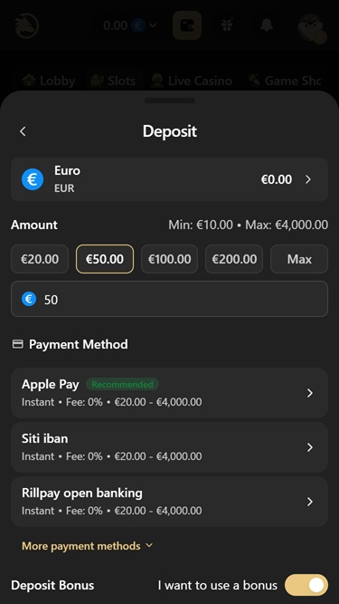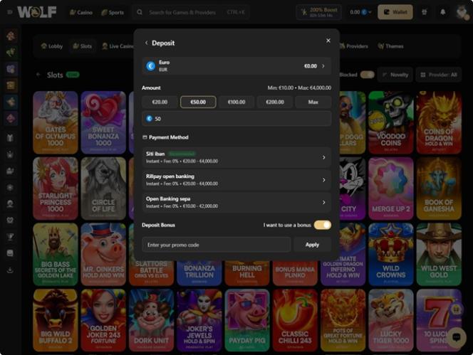 فيما يتعلق بالمدفوعات، يقبل موقع Wolf.io العديد من الخيارات المصرفية للإيداع والسحب، بما في ذلك خيارات شائعة مثل Visa و Mastercard والتحويل المصرفي و Skrill وNeteller وApple Pay وGoogle Pay وSOFORT. كما يمكن للمستخدمين إدارة أموالهم بعدة عملات رقمية، منها Bitcoin و Bitcoin Cash وCardano وDogecoin و Ethereum و Litecoin وSolana و Tron و USD Coin وTether و Ripple .