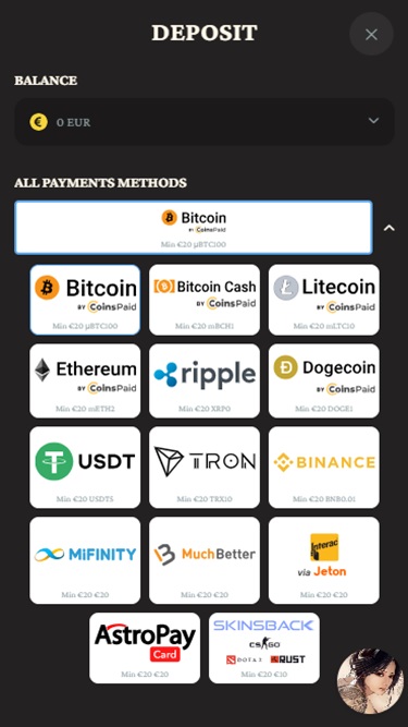 من أكثر ما يعجبنا في كازينو Yakuza.bet هو توفيره خيارات دفع متنوعة. لنفترض أنك ترغب في استخدام طرق الدفع التقليدية، مثل Visa و Mastercard و Skrill و Neteller و Paysafecard و Jeton و Neosurf و MiFinity وغيرها. في المقابل، تشمل الخيارات الحديثة العملات المشفرة مثل Bitcoin و Bitcoin Cash و Cardano و Dogecoin و Ethereum و Tron و Tether و Ripple و Litecoin .
