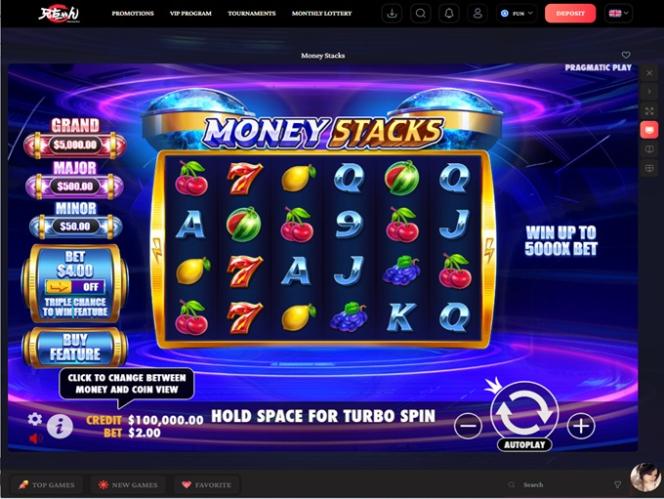 بُذلت عناية فائقة في تصميم هذه البيئة، فكل قطعة فنية رقمية رائعة تُضفي على الكازينو طابعًا فريدًا وأسلوبًا مميزًا. ويتكامل هذا مع لوحة ألوان آسرة من الرمادي والأسود والأحمر الداكن، تُكمل جميعها مظهر الموقع الإلكتروني على أكمل وجه.