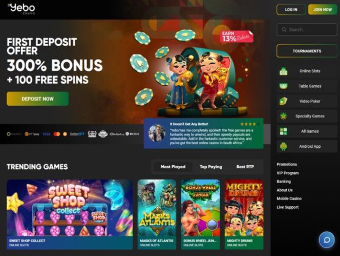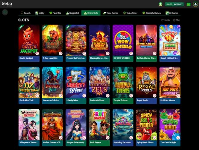 يضم كازينو Yebo مجموعة واسعة من ألعاب الفيديو سلوتس الكلاسيكية والحديثة، بما في ذلك ألعاب مثل The Big Bopper وCaesar's Empire وLucky 6 وغيرها الكثير. كما يقدم الكازينو جوائز كبرى تصاعدية بجوائز نقدية ضخمة، ويمكن للاعبين الوصول إلى العديد من ألعاب السلوتس عبر هواتفهم المحمولة.