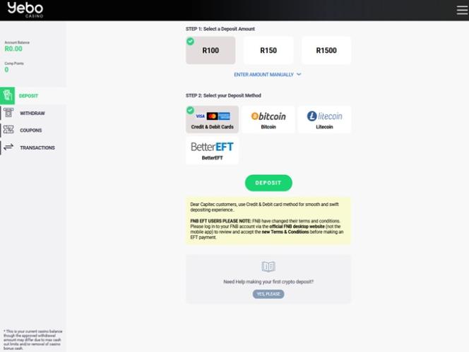 يتميز كازينو ييبو بنظام مصرفي متين، حيث يُتيح الموقع عمليات إيداع وسحب عبر سكريل ونتلر وإيكو بايز. كما يُقبل الإيداع عبر فيزا وماستركارد، ويمكن طلب التحويلات البنكية للسحب. عادةً ما يستغرق صرف الأموال عبر المحافظ الإلكترونية 24 ساعة، بينما تستغرق التحويلات البنكية ما بين 3 و7 أيام عمل. تُصرف الأموال على دفعات بقيمة 10,000 راند جنوب أفريقي.