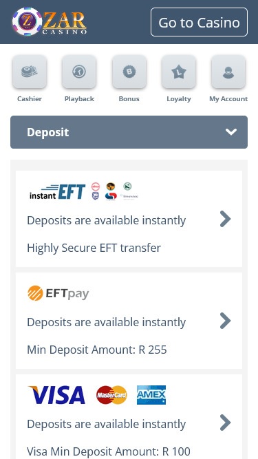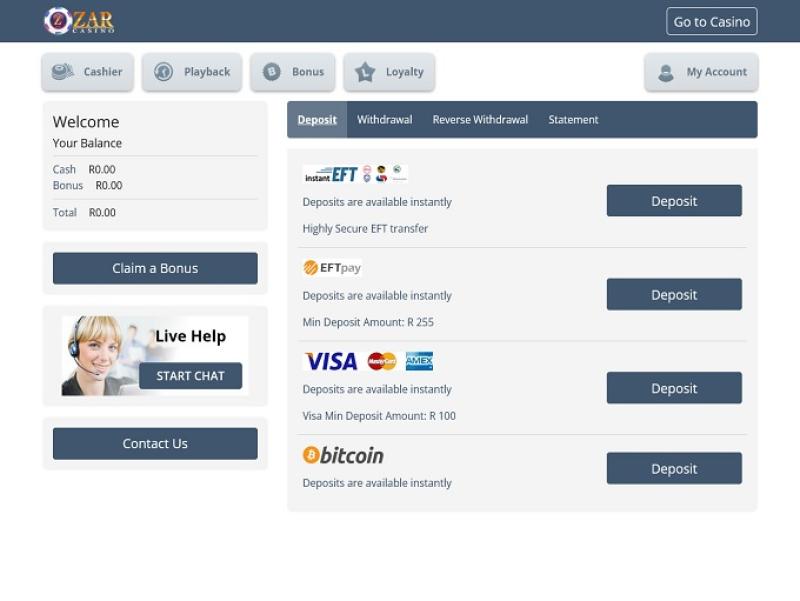 المعاملات المصرفية جيدة بعملة الزار، مع أن خيارات الإيداع والسحب محدودة نظرًا لمحدودية السوق في جنوب أفريقيا. يمكنك تحويل الأموال باستخدام بطاقات الائتمان والبيتكوين. سرعة السحب جيدة، مع أنك قد تواجه مهلة انتظار تصل إلى 48 ساعة لسحب الأموال. يوجد حد أسبوعي لسحب الأرباح بقيمة 1000 زار.