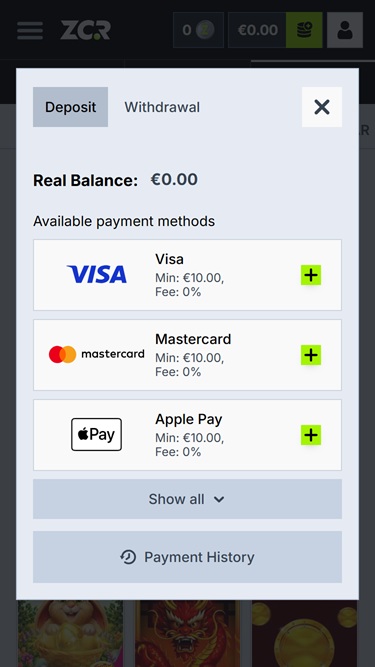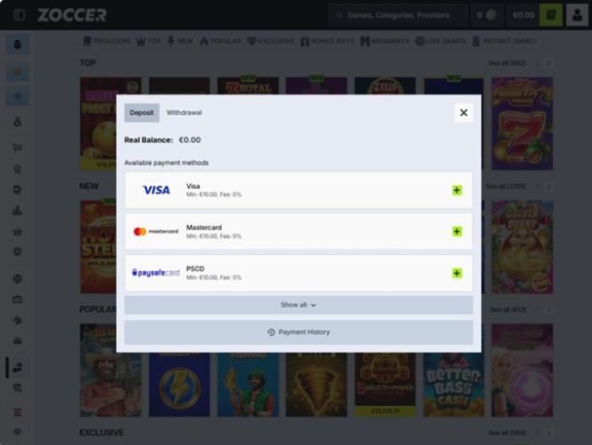 عندما يتعلق الأمر بإيداع وسحب الأموال، يتيح لك تطبيق زوكر استخدام جميع طرق الدفع تقريبًا. سواء كنت تفضل البطاقات المصرفية أو المحافظ الإلكترونية أو حتى العملات الرقمية، ستجد بالتأكيد خيارًا يناسبك في وقت قصير.