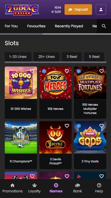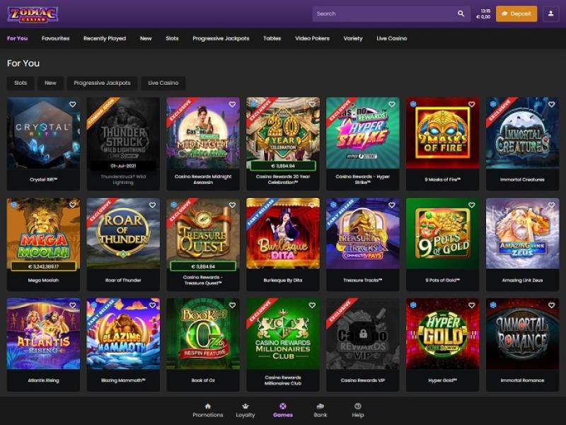 كازينو زودياك مدعوم من Microgaming, Evolution Gaming, Rabcat, Triple Edge Studios, Northern Lights Gaming, Stormcraft Studios, Switch Studios, Electric Elephant Games, All41 Studios, Gameburger Studios, Pulse 8 Studios, Neon Valley Studios, SpinPlay Games, Real Dealer Studios, GONG Gaming, Buck Stakes Entertainment, Games Global, Old Skool Studios, Foxium, Just For The Win, PearFiction Studios, Slingshot Studios, Fortune Factory Studios, Crazy Tooth Studio, Alchemy Gaming, Snowborn Games, Gold Coin Studios, Half Pixel Studios, Eurostar Studios and Aurum Signature Studios ، الذي يوفر عددًا كبيرًا من الألعاب للاعبين. يُقدم برنامج الكازينو عبر برنامج قابل للتنزيل ومنصة ويب. من المرجح أن يفضل معظم اللاعبين استخدام منصة الويب، إذ تتيح اللعب الفوري دون عناء تنزيل الملفات على جهاز الكمبيوتر.