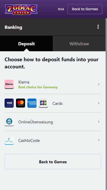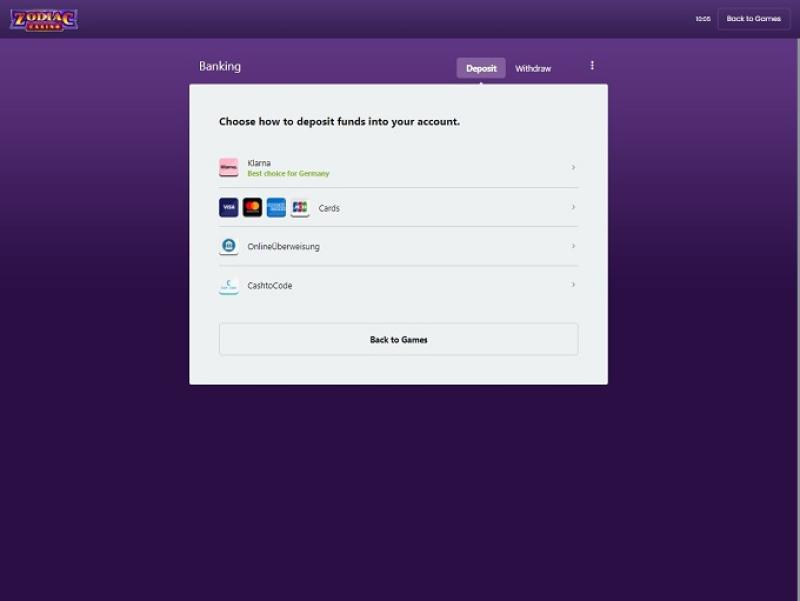 يتميز نظام زودياك المصرفي بامتيازه، إذ يوفر خيارات إيداع وسحب متنوعة تُصرف في أوقات مناسبة. يُرجى من اللاعبين ملاحظة أن حد السحب الأسبوعي يبلغ 4000 دولار أمريكي، ولكن هذا لا ينطبق على الجوائز الكبرى التراكمية.