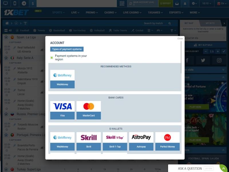 طرق الإيداع : فيزا، ماستر كارد، سكريل بنقرة واحدة، بنك تشيلي، ويب موني، أسترو باي، ماتش بيتر، ستيك باي، سيرفيباغ باي سكريل، باغوس إن إيفيكتيفو، ترانسفيرينسيا بانكاريا، ترانسفيرينسيا إلكترونيكا، مدفوعات العملات المشفرة، 1 إكس بيت، إيكو بايز، نيتيلر، دوج كوين، نيم، مونرو، نيم، بيتكوين جولد، إيثيريوم كلاسيك، كيو تي يو إم، سكريل، بيرفكت موني، جيتون واليت، باير، لايت كوين، إيثيريوم، زد كاش، ديجي بايت، بيتكوين كاش، فيرج، ريبل، بينانس كوين بي إس سي، باريس سان جيرمان، يوفنتوس، إيه إس روما، شيبا إنو على بي إس سي، شيبا إنو على إيثيريوم، بينانس دولار أمريكي، تيثير على بي إس سي، بولكادوت، كوزموس أتوم، أفالانش إكس تشين، تونكوين، إيوس، دولار أمريكي على إيثيريوم، ترو دولار أمريكي، باكس دولار، تيثير على الإيثريوم، التيثر على الترون، البيتكوين المغلف على الإيثريوم، داي، كاردانو، تشين لينك، شبكة OMG، رمز الاهتمام الأساسي، الترون، ستيلر، وبت شيرز.