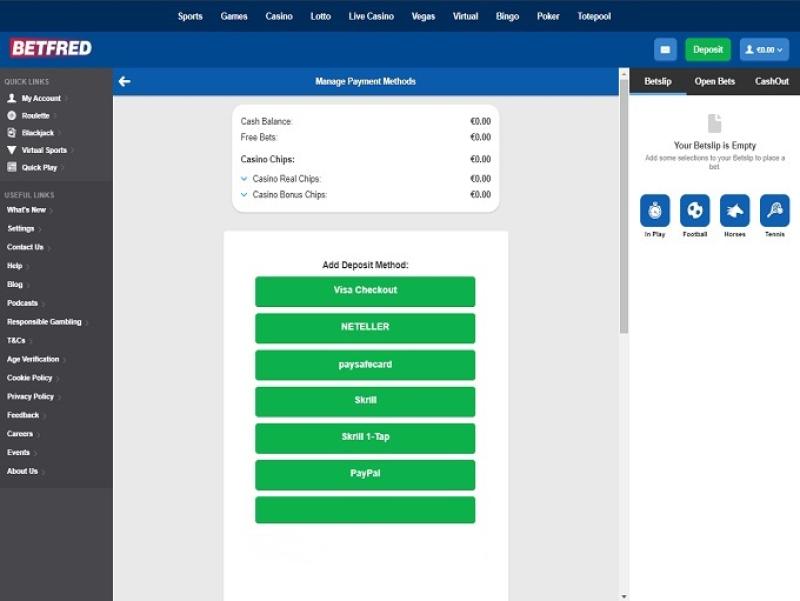 تشمل طرق الإيداع Maestro وVisa وVisa Electron وMastercard وNeteller وPayPal وSkrill وPaysafe والتحويل البنكي ومتاجر Betfred.