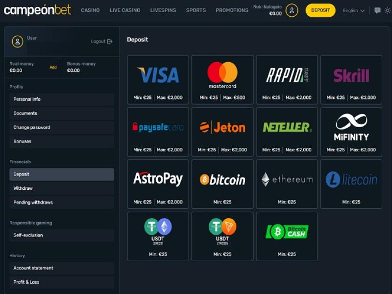 طرق الإيداع: Visa، Sepa، Neteller، Skrill، Jeton Wallet، Pay Safe Card، Eco Payz، i – Deal، Giro Pay، Much Better، Neo Surf، Safe Charge، E – Pro، E – Voucher، Mi Finity، Rapid Transfer، Bitcoin Cash، Bitcoin، Ethereum، و Litecoin.