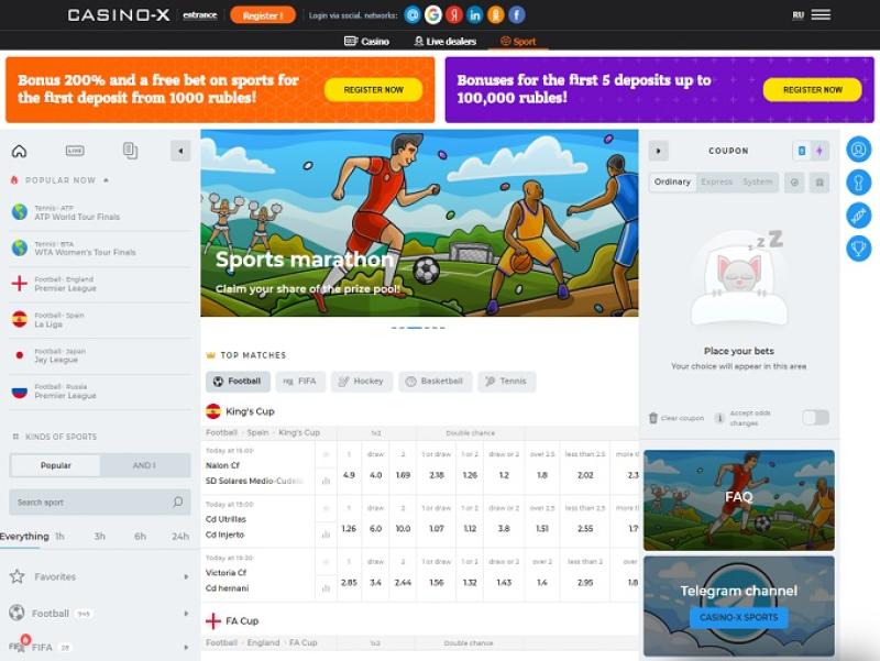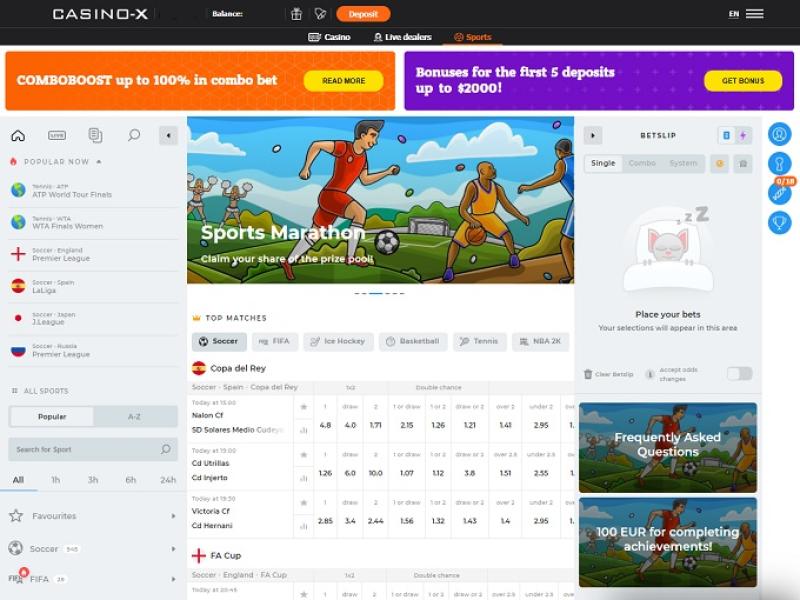 بالنظر إلى كل شيء، يُعد كازينو-إكس موقعًا ضخمًا للمراهنات الرياضية، لا يتوانى عن إغداق مراهنيه بمجموعة هائلة من الأحداث الرياضية للمراهنة عليها. يوفر الموقع عشرات الرياضات، والرياضات الافتراضية، والرياضات الإلكترونية، وسباقات السيارات، مع إمكانية المراهنة المباشرة.