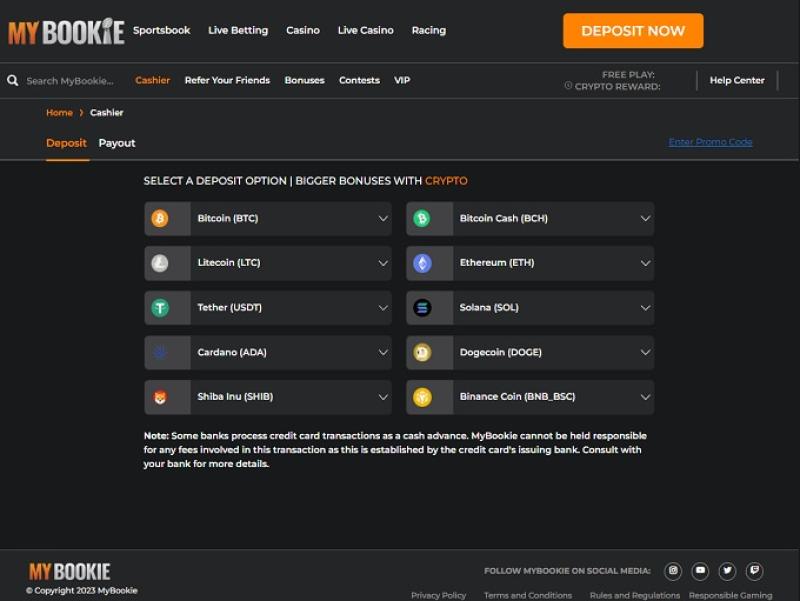 يوفر MyBookie مجموعة واسعة من خيارات الإيداع والسحب. لكل خيار مزاياه وعيوبه، ولكننا ننصحك بالتعامل مع بيتكوين إن أمكن، فهي أسرع طريقة لإيصال أرباحك إليك. مدة معالجة الطلبات على الموقع 48 ساعة، ولكل طريقة حد أدنى وحد أقصى.