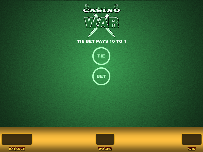 فيما يلي لعبة حرب الكازينو . يجب عليك المراهنة على الرهان الرئيسي للعب، ويمكنك أيضًا المراهنة اختياريًا على رهان التعادل . بعد وضع رهانك (رهاناتك)، ستوزع اللعبة بطاقة واحدة لك وبطاقة واحدة للموزع، تفوز البطاقة الأعلى (الآسات هي الأعلى). في حالة التعادل، يدفع رهان التعادل (إذا تم وضعه) 10 إلى 1، ويُمنح لك خيار الاستسلام أو الذهاب إلى الحرب. إذا استسلمت، فإنك تخسر نصف رهانك الرئيسي وتنتهي اللعبة. إذا ذهبت إلى الحرب، يجب عليك وضع رهان آخر يساوي رهانك الرئيسي، ثم تتلقى أنت والموزع بطاقة أخرى. تفوز بالحرب إذا كانت بطاقتك الثانية مساوية أو أعلى من البطاقة الثانية للموزع. عندما تفوز، يدفع رهانك الرئيسي مبلغًا متساويًا، وإذا ذهبت إلى الحرب، فإن الرهان الإضافي يدفع.