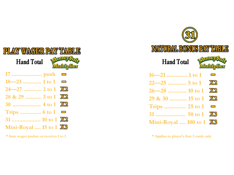 هذه لعبة ورق كازينو جديدة نسبيًا، تجمع بين أفضل ما في عالمَي البلاك جاك والبوكر . تُلعب لعبة Money$suit 31 بمشاركة ما يصل إلى سبعة لاعبين ضد بعضهم البعض. الهدف هو جمع ما يصل إلى ثلاث بطاقات للحصول على قيمة 17 أو أعلى ، حتى 31، باستخدام نظام نقاط البلاك جاك (الوجه يساوي عشر نقاط، بينما الآس يساوي دائمًا أحد عشر). الشرط هو أن تكون بطاقات القيمة من نفس النوع.