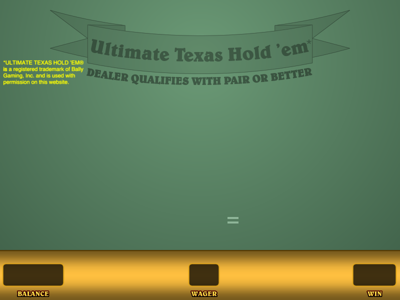 استمتع بلعبة Ultimate Texas Hold 'Em® الإلكترونية التالية. يتطلب الأمر استخدام JavaScript كحد أدنى، كما يتطلب Java تقديم نصائح مثالية. إذا لم يكن لديك Java مثبتًا أو مُفعّلًا، فلا يُمكن تقديم نصائح استراتيجية لقرار زيادة الرهان بمقدار 2x إلا في الحالات الواضحة (مثل زيادة الرهان بـ Straight أو أعلى).