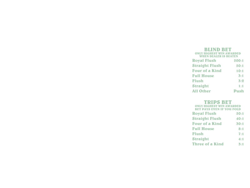 احتمالات الرهان الأعمى : يُدفع الرهان الأعمى بناءً على قوة اليد الأخيرة للاعب، حيث تُحقق أيادٍ مثل الستريت أو الفلوش أو أي يد أعلى عوائد أعلى. على سبيل المثال، عادةً ما يدفع الستريت 1:1، بينما قد يدفع رويال فلوش 500:1 ، وذلك حسب جدول مكافآت الكازينو الإلكتروني.