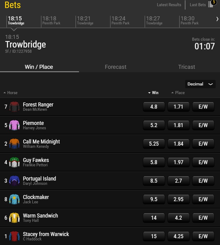 أعتقد أن الرياضات الافتراضية هي أبرز نقاط قوة 1X2. حتى وقت كتابة هذه السطور، لديهم 19 رياضة للاختيار من بينها. وتوفر جميعها خيارات متنوعة للمراهنة. رياضات مثل التنس تتيح المراهنة أثناء اللعب. رسوم الألعاب قصيرة وبسيطة، باستثناء ألعاب السباقات، المصممة بشكل ممتاز. تُقام السباقات أو المباريات كل دقيقتين تقريبًا.