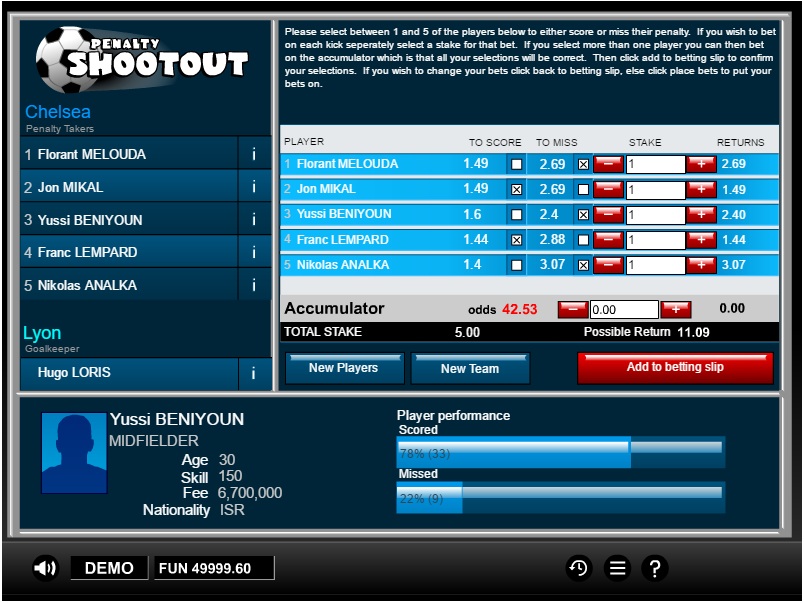 إليكم لعبة حظ بسيطة أخرى تعتمد على 1×2. يراهن اللاعب على ما إذا كان كل لاعب من اللاعبين الخمسة سيسجل أو يهدر ركلة جزاء في كرة القدم. بافتراض تساوي نسبة ربح الكازينو في كلتا الحالتين، أتوقع أن تبلغ حوالي 96%.