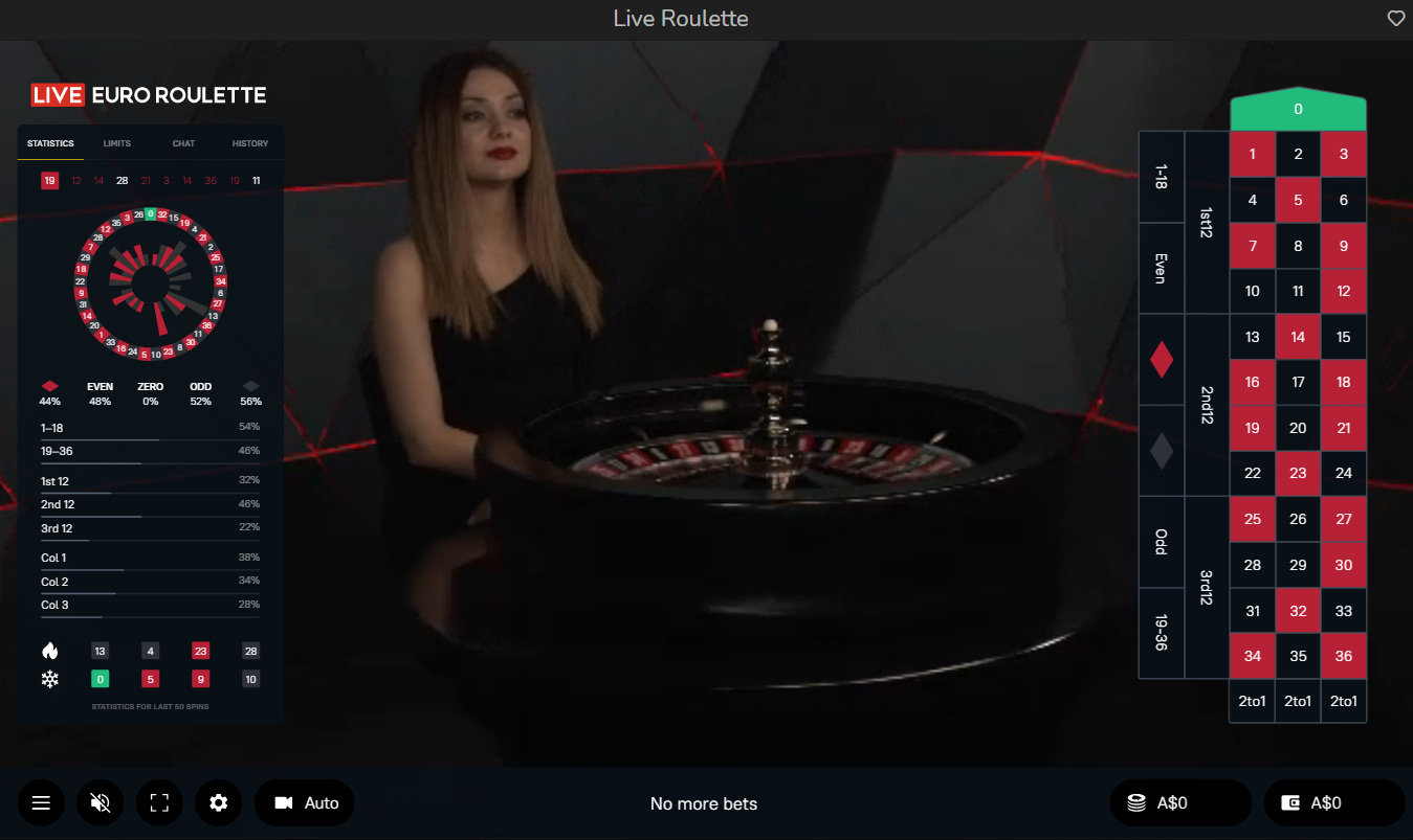 - الروليت المباشر - تُلعب هذه النسخة مع موزع حقيقي على عجلة ذات صفر واحد. نسبة ربح الكازينو ٢٫٧٠٪.