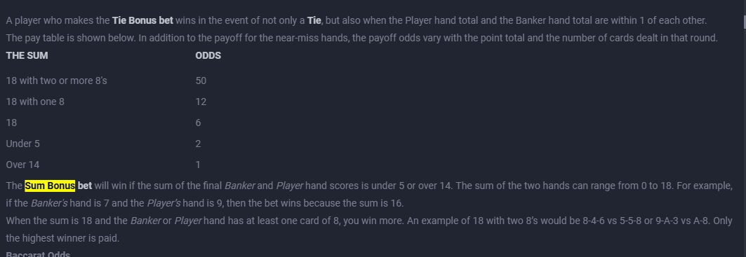 تُلعب الباكارات بطريقتين: الطريقة التقليدية مع عمولة ٥٪ على رهانات الموزع، بالإضافة إلى طريقة سوبر ٦، والتي أشير إليها بالنسخة النيبالية من الباكارات الخالية من العمولة. فيما يلي هامش ربح الكازينو للرهانات المقدمة في لعبة الباكارات التقليدية.
