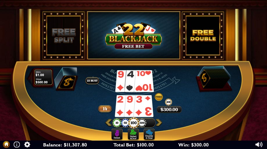 في هذه اللعبة، يمكن للاعب مضاعفة رهاني (على مجموع 9 إلى 11) أو تقسيمهما (أي رهان باستثناء 10) مجانًا. لكن المشكلة تكمن في أنه إذا سحب الموزع إلى 22، فسيتم سحب أي رهانات متبقية. تدّعي شركة Dragon Gaming أن ميزة الكازينو في اللعبة تبلغ 1.55%. وفقًا للقواعد القياسية، تبلغ ميزة الكازينو لديّ 1.04%. لمزيد من المعلومات، يُرجى زيارة صفحتي على "بلاك جاك الرهان المجاني" .