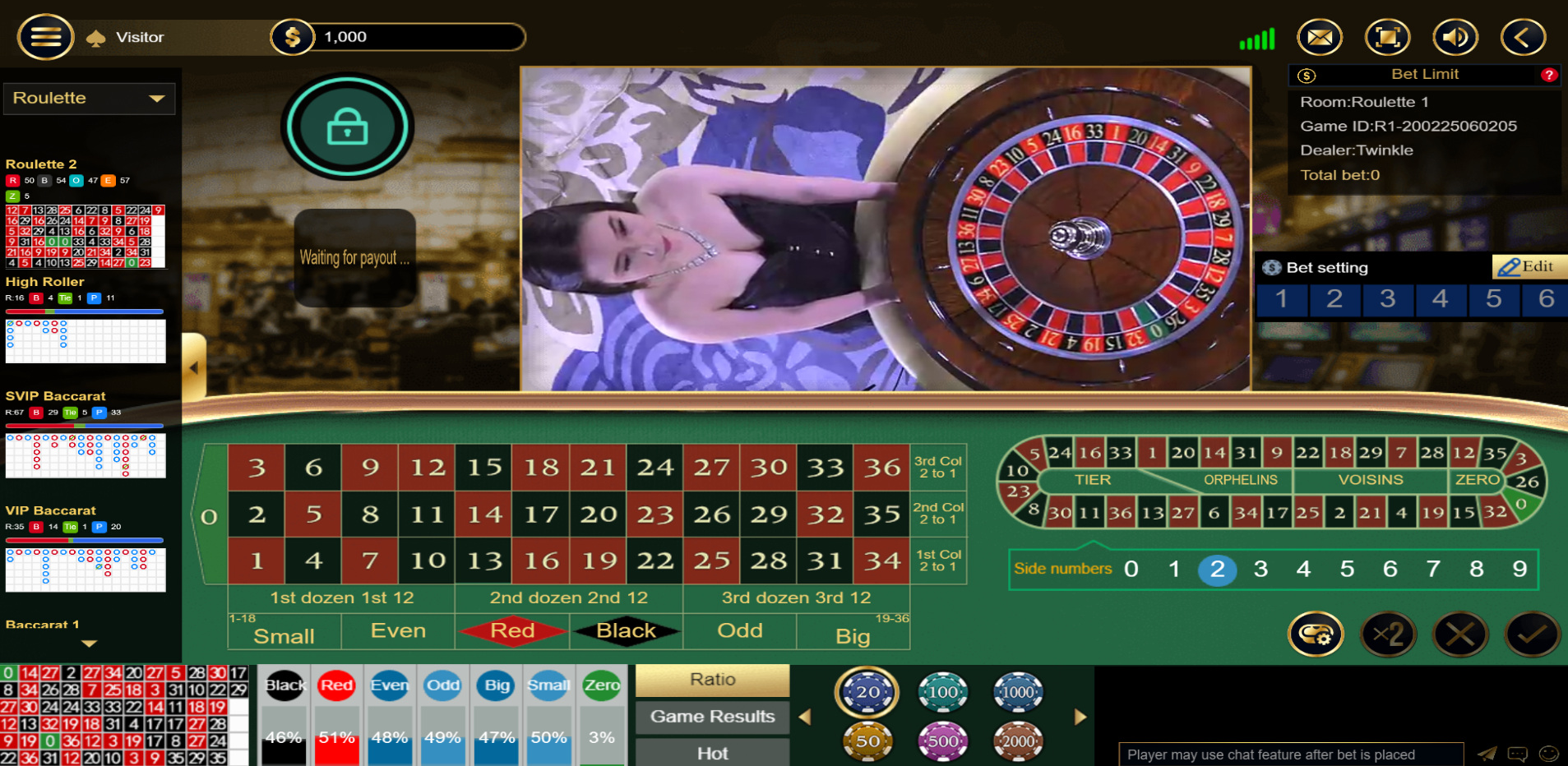 كما هو الحال في ألعاب الموزع المباشر، تكون عجلة الروليت ذات صفر واحد. زاوية الكاميرا موجهة مباشرةً نحو العجلة. أما بالنسبة للاعبين المتشككين، فلا توجد لوحة تاريخ حمراء/سوداء للعجلة التي يلعبون عليها فحسب، بل لعجلات الروليت المباشرة الأخرى أيضًا. تبلغ نسبة ربح الكازينو على كل رهان 2.70%.