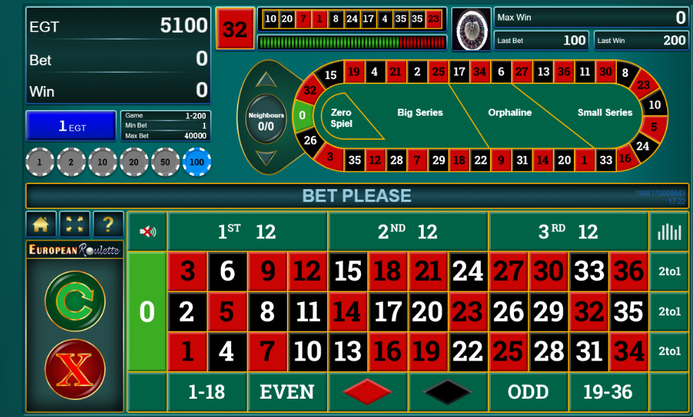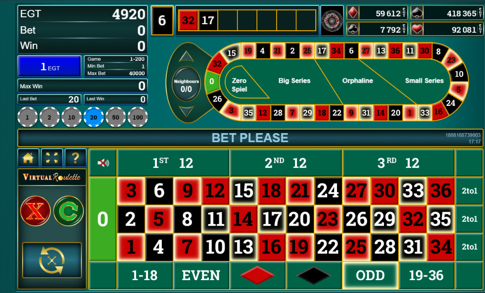 تتوفر لعبتا روليت، كلاهما بصفر واحد. الروليت الافتراضية إلكترونية بالكامل. أما الروليت الأوروبية فتعتمد على عجلة حقيقية، مع فترة زمنية محددة بين كل دورة والأخرى. كلتا اللعبتين بسيطتان وسريعتان. نسبة ربح الكازينو على كل رهان هي ٢٫٧٠٪ في كلتا اللعبتين.