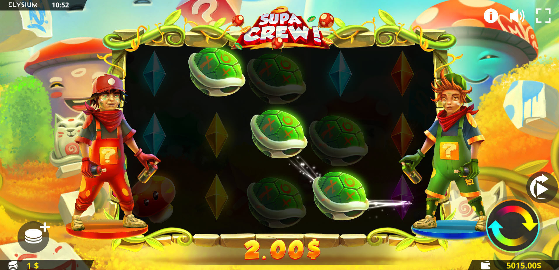 - Supa Crew - تتميز هذه اللعبة ذات الخمس بكرات بالعديد من رموز "العملات المعدنية" التي تُقلب لتكشف عن رمز عشوائي. إذا حصل اللاعب على عدة عملات معدنية في نفس الدورة، فستُقلب جميعها إلى نفس الشيء. هناك أيضًا عملات معدنية خارقة تُغطي مربعًا 3×3 على الشاشة بالعملات المعدنية. بالإضافة إلى ذلك، هناك رموز مضاعفة 2×2 تُعطي ربحًا عشوائيًا. وأخيرًا، هناك Supa Crew Brothers التي تُحوّل بعض الرموز الخاسرة إلى رموز رابحة.