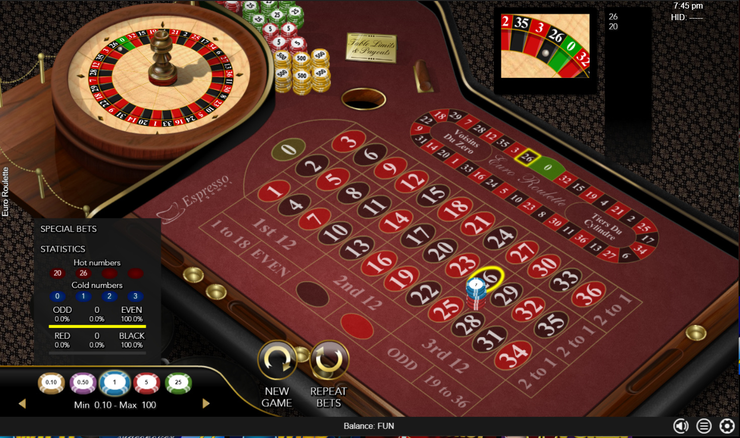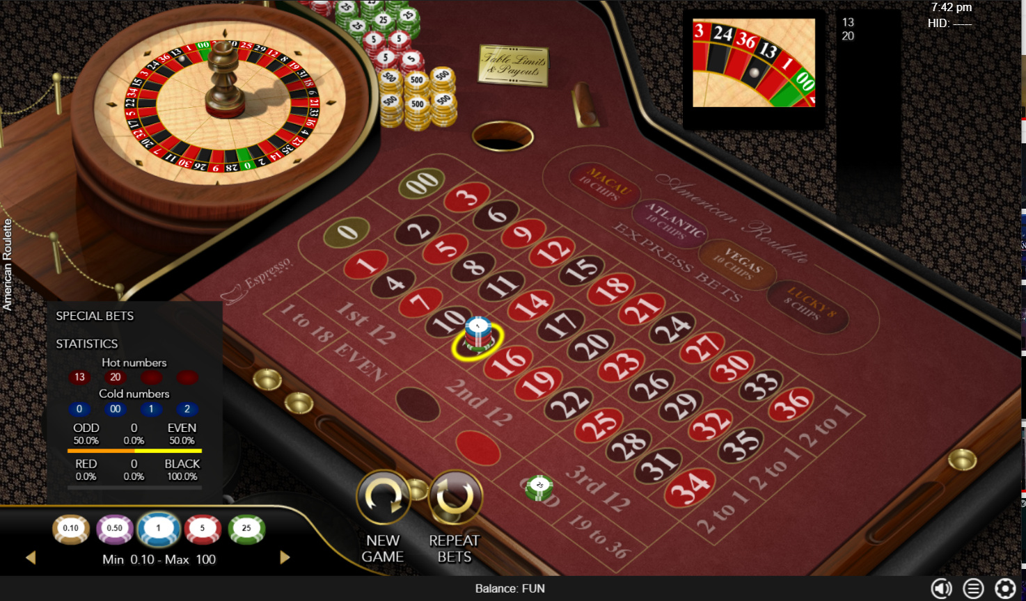 - الروليت الأوروبية - هذا ما أسميه "الروليت الفرنسية"، حيث تخسر رهانات الأموال المتساوية نصفها عندما تستقر الكرة على الصفر. هذا ينتج عنه هامش ربح للكازينو بنسبة 1.35% على رهانات الأموال المتساوية و2.70% على جميع الرهانات الأخرى. الروليت لا مثيل له، وإسبريسو من الأماكن القليلة التي تقدم هذه القواعد المتحررة.