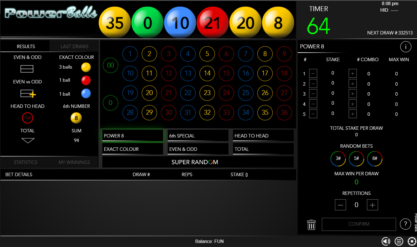 لعبة "كرات القوة" هي لعبة تشبه الكينو/اليانصيب. ست كرات من أصل 38 كرة مرقمة (من 1 إلى 36، 0، و00). هناك 12 كرة حمراء وزرقاء وصفراء، وكرتان خضراوان. هناك طرق عديدة للمراهنة على النتيجة. لقد حللتُ ألعابًا مشابهة سابقًا، لذا أرجو المعذرة إن لم أحلل كل رهان. للحصول على فكرة عن العائد، ركزتُ فقط على الرهانات التي يختار فيها اللاعب لونًا (أحمر، أزرق، أو أصفر) وعدد الكرات التي ستظهر من هذا اللون. يوضح الجدول التالي قيمة كل رهان، واحتمالية الفوز، والعائد المتوقع. كما ترون، جميعها تقترب من 95%، باستثناء الكرات الست التي تطابق اللون المختار.
