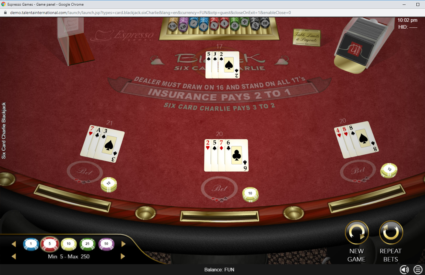 أخيرًا، تُقدّم لعبة بلاك جاك "ستة بطاقات تشارلي" قاعدةً لم أرَ مثلها من قبل، حيث يفوز اللاعب تلقائيًا بيده المكونة من ست بطاقات، ويدفع 3 إلى 2. لقد رأيتُ قاعدة الفوز التلقائي مراتٍ عديدة، لكن دفع 3 إلى 2 أمرٌ جديد. اضطررتُ إلى إجراء بعض التحليلات لمعرفة تأثير هذه القاعدة، والتي تُخفّض نسبة ربح الكازينو بنسبة 0.31%، باتباع استراتيجيةٍ سليمة. بدون هذه القاعدة، كانت نسبة ربح الكازينو ستكون 0.70%، لذا مع التخفيض بنسبة 0.31%، أحصل على نسبة ربح للكازينو 0.39%.