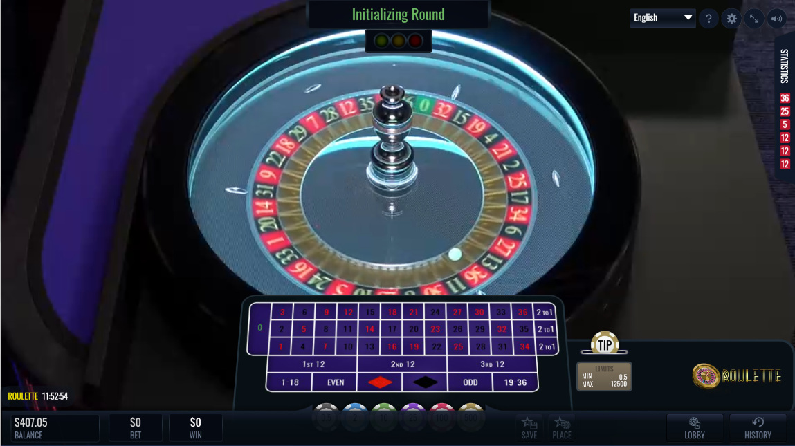 الروليت هي النسخة المعتادة من الصفر المفرد، مع هامش كازينو بنسبة ٢٫٧٠٪ على كل رهان. الخلفية النيونية واللباد الأرجواني يُعيدانني إلى سبعينيات القرن الماضي.