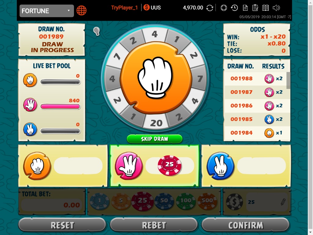 هناك نسختان من لعبة "حجر ورقة مقص". النسختان الكلاسيكية والسوبر تُلعبان وفقًا للقواعد التقليدية، باستثناء أن التعادل يُعطي عائدًا بنسبة 0.9 إلى 1. أما نسختا "المحظوظ" و"الثروة" فتستخدمان عجلة لتحديد الفوز، وتُعطي التعادلات عائدًا بنسبة 0.8 إلى 1. لا تغرك الأرقام الكبيرة على العجلة. تُظهر عينة من 105 ألعاب أن متوسط الفوز 1.92 فقط، بعائد إجمالي 90.79%.