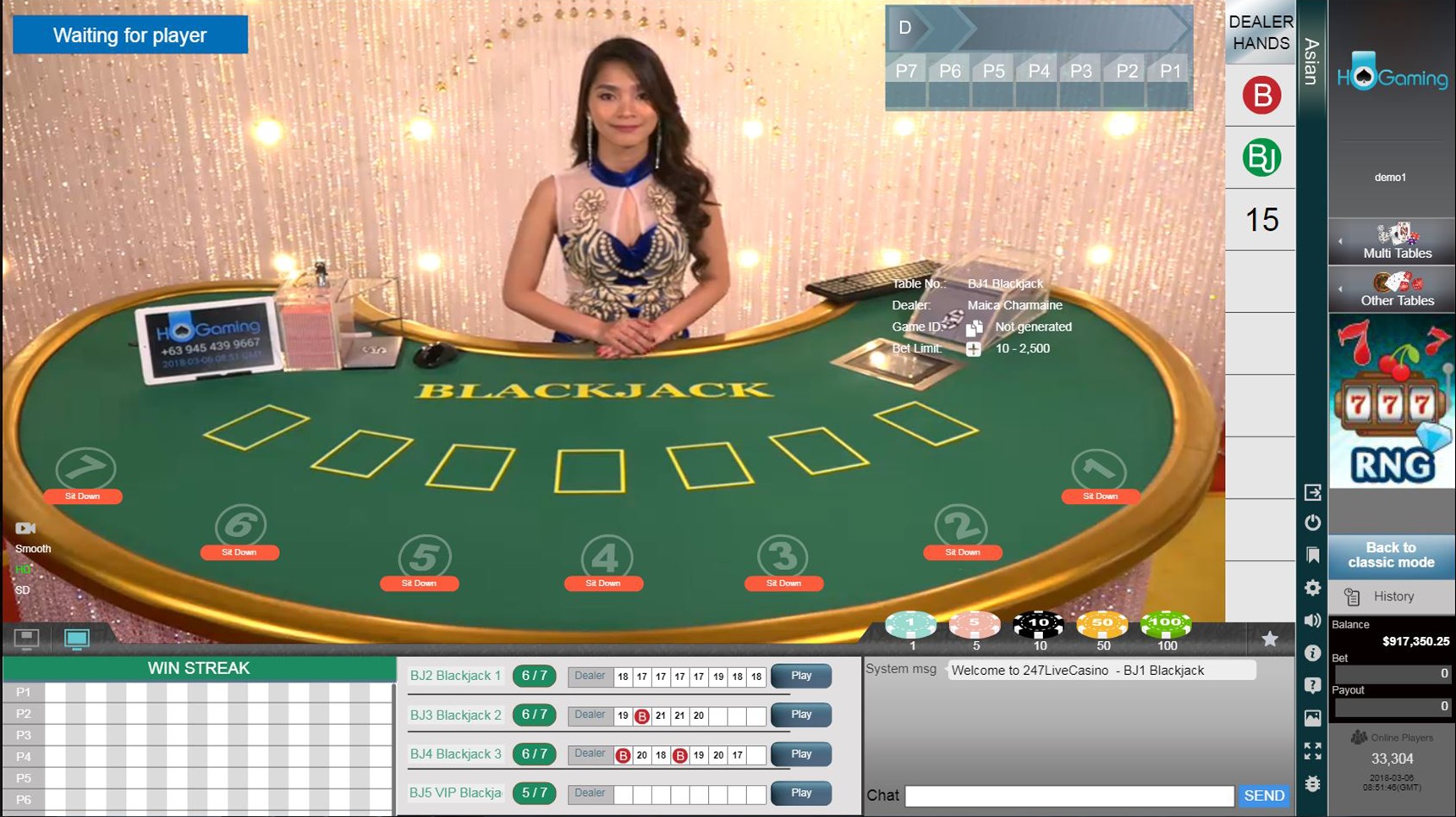 من الجدير بالذكر في مكتبة المجموعة مجموعة ألعاب الكازينو المباشرة، والتي تتيح للمقامرين المشاركة في إصدارات البث المباشر من الباكارات والروليت والبلاك جاك ودراجون تايجر وسيك بو وغيرها. لا تفي مراجعة البرنامج هذه بمعاييرنا العالية عادةً، نظرًا لقلة المعلومات التي نعتمد عليها. يوفر موقع الشركة الإلكتروني لقطات شاشة لكل لعبة، ولكنه لا يسمح باللعب المجاني ولا بأي ملفات مساعدة. لذلك، اعتمدنا على ما توصلنا إليه من لقطات الشاشة. إذا كان بإمكان أي شخص مساعدتنا في ملء القواعد غير المعروفة، يُرجى مراسلتنا.