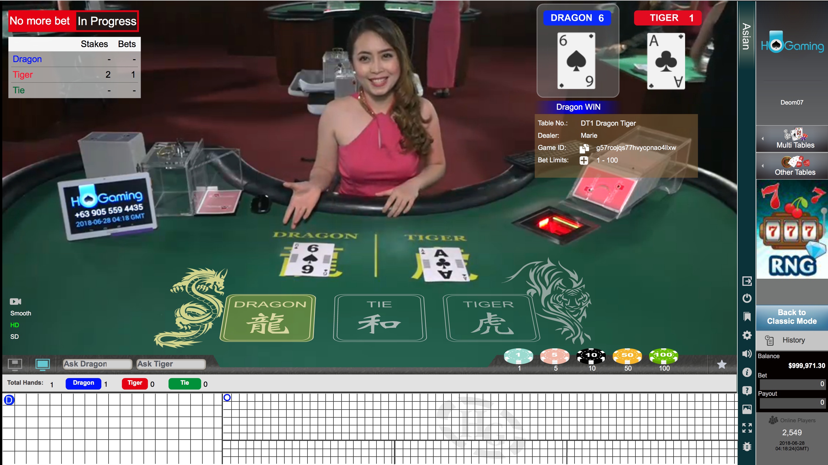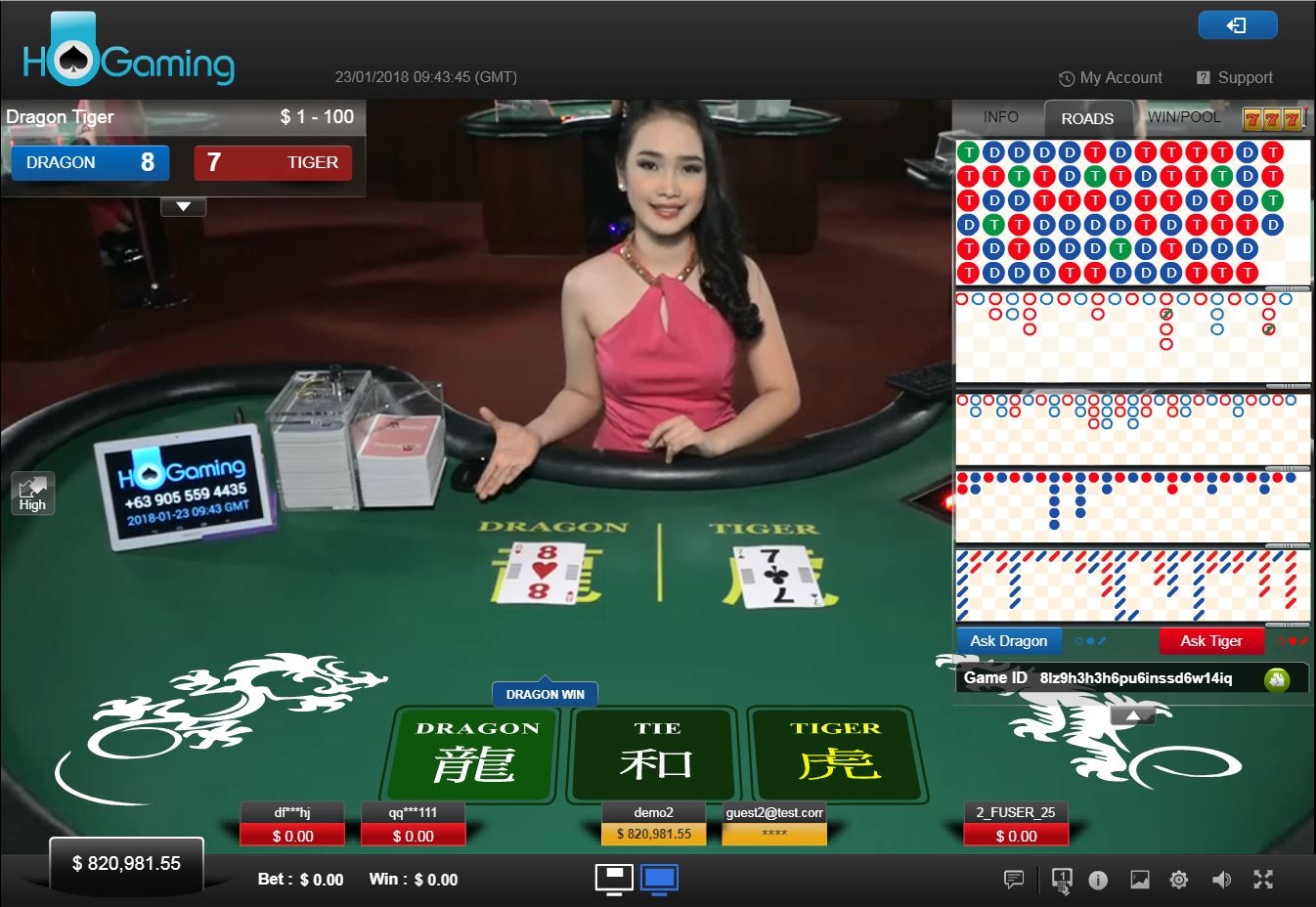 لعبة دراغون تايجر بسيطة للغاية، حيث يحصل كل من التنين والنمر على ورقة واحدة، ويختار اللاعب أيهما أعلى. يوجد أيضًا رهان على التعادل. يخسر رهانات التنين والنمر نصفها عند التعادل، مع هامش ربح للكازينو بنسبة 3.73%. لا يوضح موقع HoGaming قيمة ربح التعادل، ولكن في ألعاب الموزع المباشر الأخرى، عادةً ما يدفع اللاعبون 8 إلى 1، مع هامش ربح للكازينو بنسبة 32.77% (يا إلهي!).