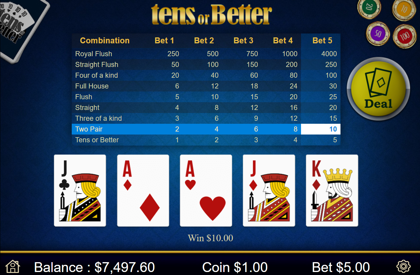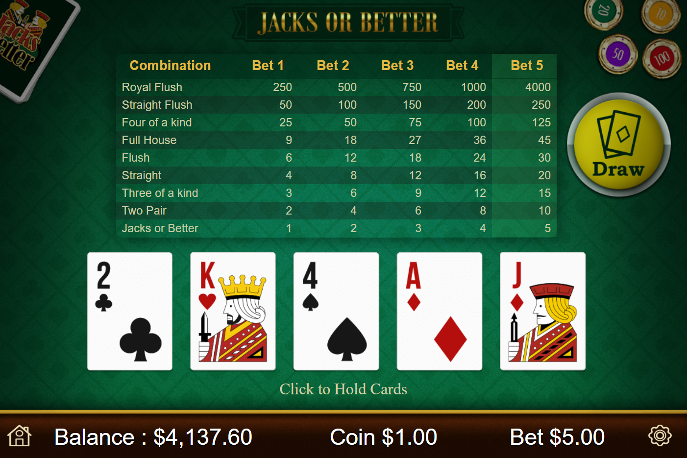 | Jacks or Better | 99.46% | لا | 1-2-3-4-6-9-25-50-800 | لا |