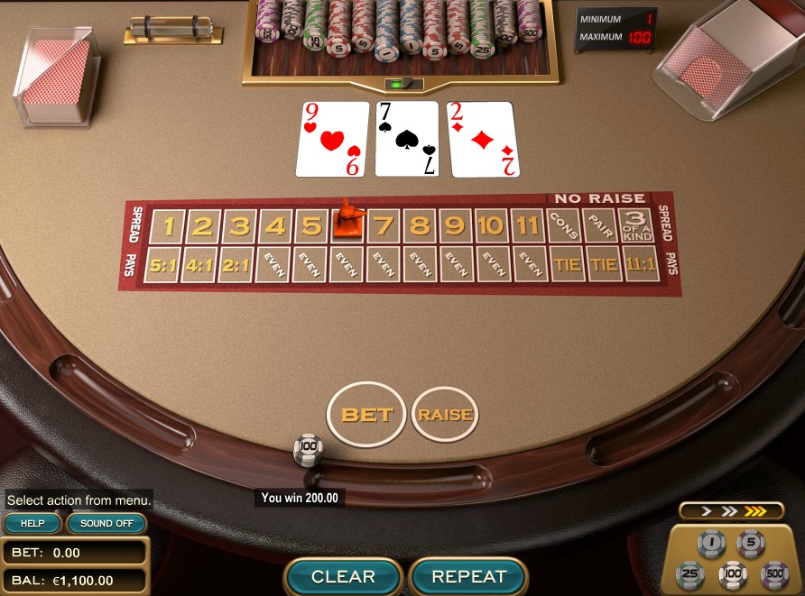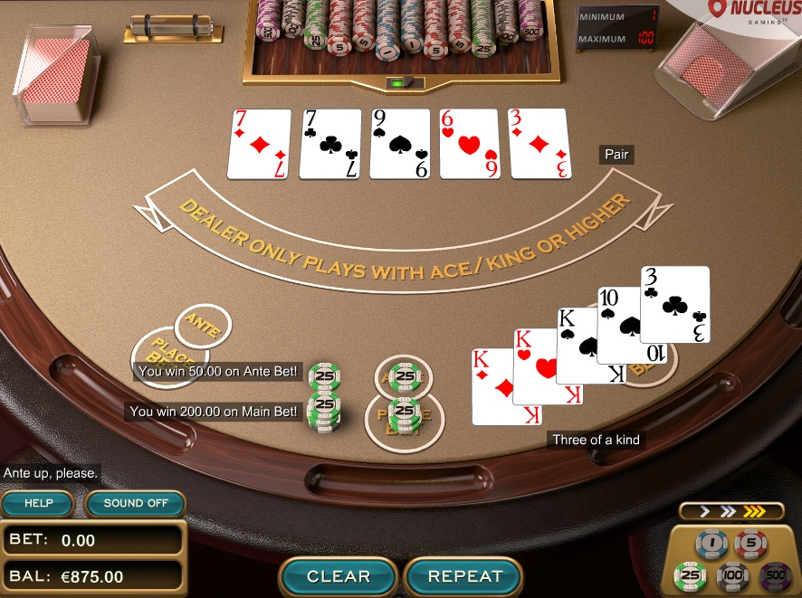 يُطلق نوكليوس على لعبة بوكر الثلاث أوراق اسم بوكر تريبل إيدج. مكافأة الرهان الأولي تتبع جدول الدفع 1-4-5، مما يُعطي هامشًا للكازينو بنسبة 3.37% على رهان الرهان الأولي. أما مكافأة الرهان الإضافي، فتُطبق على جدول الدفع 1-4-6-30-40، مما يُعطي هامشًا للكازينو بنسبة 2.32%.