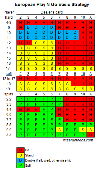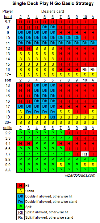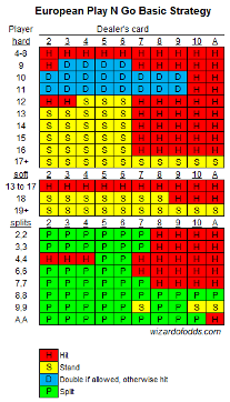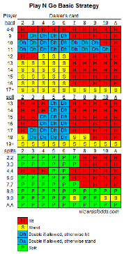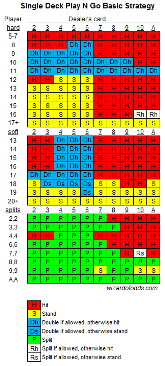 تبلغ نسبة ربح الكازينو 1.26% بموجب هذه القواعد. لا داعي للعب هذه اللعبة مع توفر نسبة ربح كازينو 0.46% في لعبتهم القياسية. مع ذلك، إذا كنتَ مضطرًا، فانقر على الصورة أدناه للاطلاع على نسخة أكبر من الاستراتيجية الأساسية لهذه القواعد. تحذير: هذه استراتيجية غير تقليدية نظرًا لقواعدها غير التقليدية.