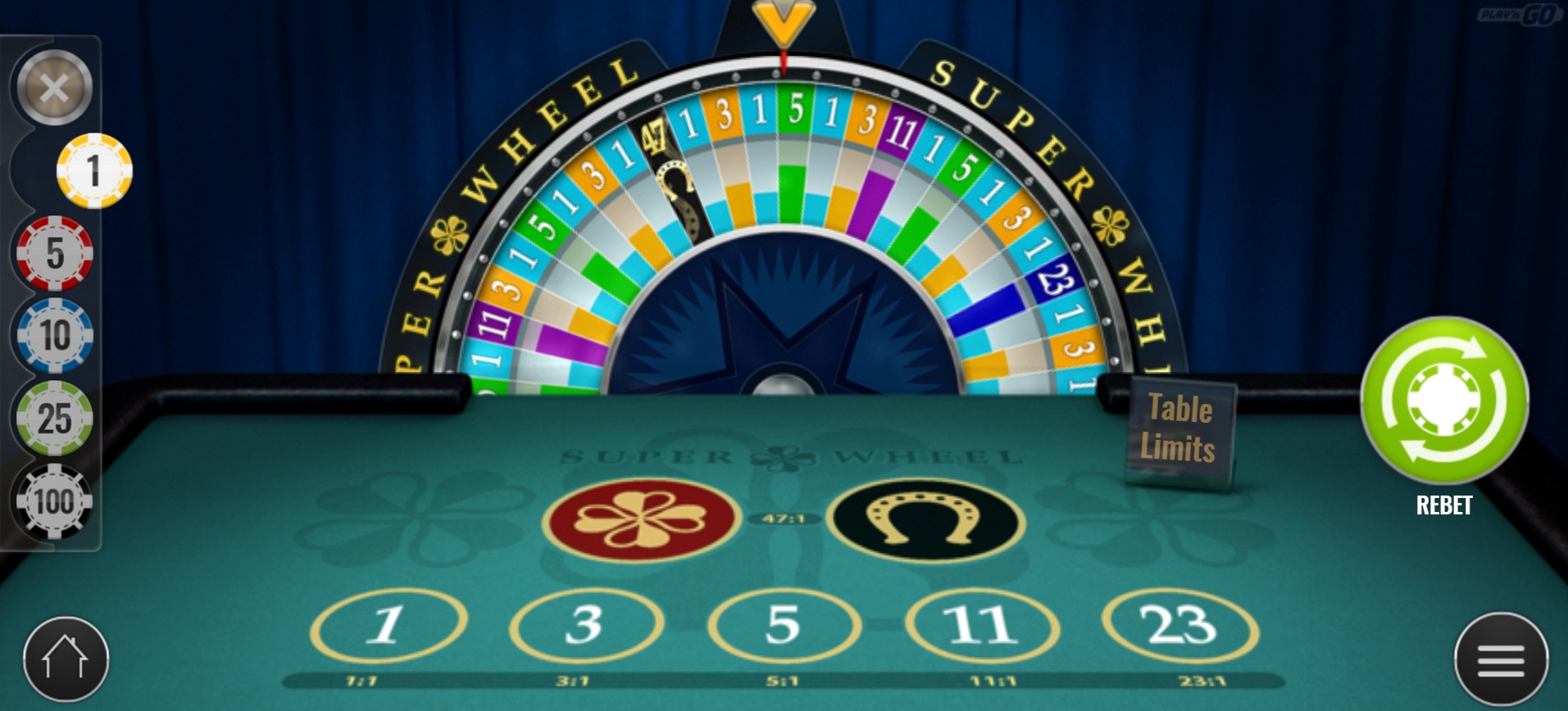 تتميز لعبة Play N' Go بعجلتين كبيرتين . الأولى تُسمى "عجلة المال"، وتتوافق مع قواعد ماكاو الصارمة، مع هامش ربح للكازينو يتراوح بين 7.69% على رهانات 1 و3 و5 دولارات، و19.23% على رهانات 20 دولارًا. أما إذا كنت مضطرًا للعب، فإن لعبة "العجلة الخارقة" تتبع القواعد الأسترالية المتحررة، مع هامش ربح للكازينو بنسبة 7.69% على كل رهان.