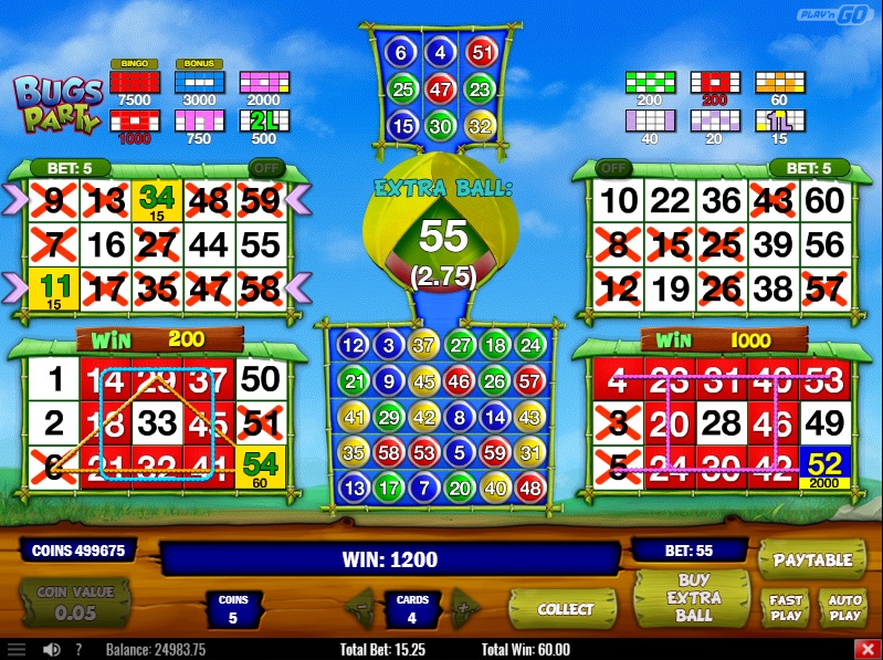 هناك لعبتان لبطاقات الخدش، كما هو موضح أعلاه. يشير ملف المساعدة إلى أن العائد في كليهما هو 96%. كلاهما يقدم كرات إضافية، ولكن بمقابل. كما أن لكل منهما لعبة إضافية، مع أنني ربحتها في لعبة Flying Pigs، ولكن لم تُمنح لي أي مكافأة. كانت المكافأة في لعبة Bugs Party مشابهة لمكافأة Jackpot Party.