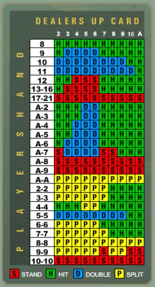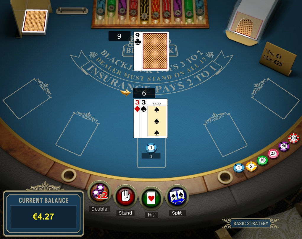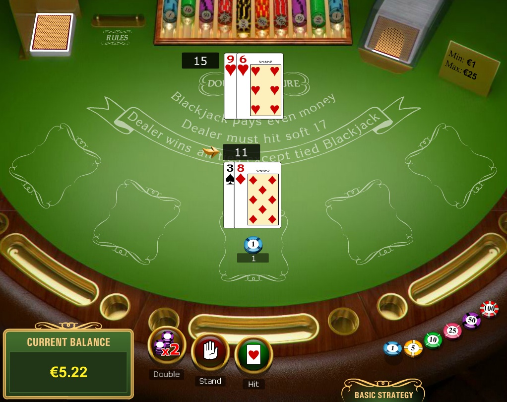 هناك لعبتا بلاك جاك أعرفهما: بلاك جاك رويال وبلاك جاك متعدد الأيدي. للأسف، لم أجد قواعدهما في أي مكان. مع ذلك، من خلال دراسة الطاولة، ولعب يد واحدة (لم يتبقَّ في الحساب الذي لعبتُ فيه سوى بضعة دولارات)، ومخطط الاستراتيجية الأساسية، يمكنني على الأقل استنتاج ما يلي: