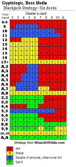 الاستراتيجية الأساسية الصحيحة هي نفسها المُتبعة في لعبة Cryptologic وBoss Media متعددة اللاعبين، كما يلي. تجدر الإشارة إلى أنه حتى لو فاز اللاعب بنتيجة 3-2 في البلاك جاك بعد تقسيم العشرات، فلا ينبغي عليه تقسيمها أبدًا.