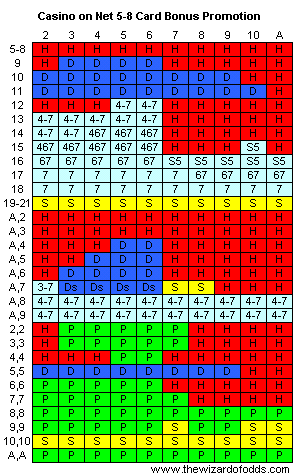 قدم كازينو أون نت عرضًا ترويجيًا مرتين، حيث يحصل أي يد تتكون من 5 أوراق أو أكثر ولم تُخسر على مكافأة. مكافأة 5 أوراق هي نصف الرهان، ومكافأة 6 أوراق تساوي الرهان، ومكافأة 7 أوراق تساوي خمسة أضعاف الرهان، ومكافأة 8 أوراق تساوي 50 ضعف الرهان. أخبرني فريق كازينو أون نت أن القاعدة تُحتسب على الأيدي الناتجة عن الانقسام. للأسف، يعتمد البرنامج تلقائيًا على 21 ناعمة في هذا العرض الترويجي. إذا اتبع اللاعب استراتيجية مثالية تعتمد على التركيبة، فسيكون لديه أفضلية 0.55%.