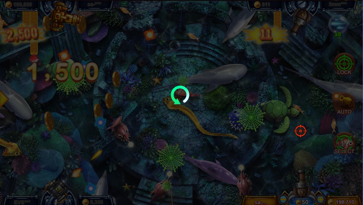 ظاهريًا، يبدو أن هدف لعبة "صياد الذهب" هو صيد الأسماك. في الواقع، هو مُنجز بإتقان. هذه الصورة لا تُنصفها، فهي ليست بهذا القتامة، لكن يبدو أن برنامج التقاط الشاشة الخاص بي لم يُعجب اللعبة. لم أجد أي قواعد للعبة، ولكن بناءً على ألعاب مشابهة رأيتها في أماكن أخرى، في كل مرة تُطلق فيها النار، يكون الرهان عشوائيًا، ومقدار ربحك لا يعتمد على إصابة أي سمكة. صححني أحد إن كنت مخطئًا.