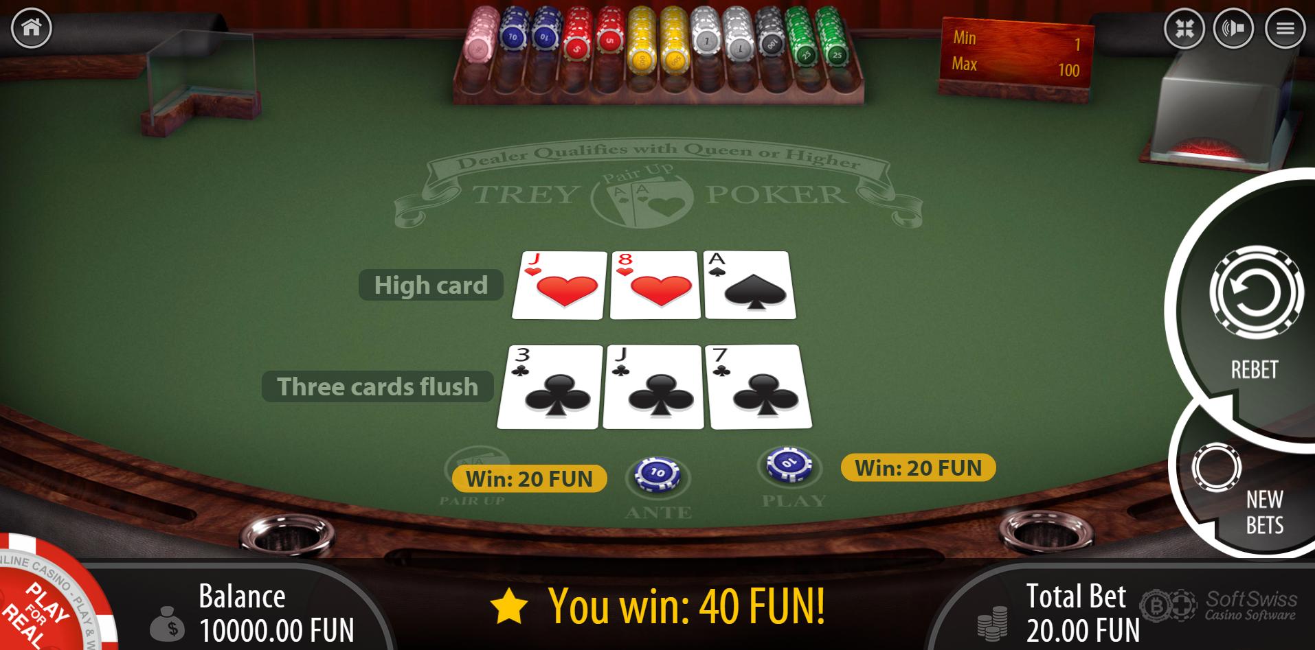 تُطلق شركة SOFTSWISS على لعبة البوكر ثلاثية الأوراق اسم "Trey Poker". تتبع مكافأة "Ante" جدول الدفع المعتاد 1-4-5، مما يُعطي ميزة للكازينو بنسبة 3.37%. أما ما يُسمى عادةً برهان "Pair-Plus"، فيُطلقون عليه رهان "Pair Up"، والذي يتبع جدول دفع 1-3-6-30-40-100 (بما في ذلك 100 لبطاقة رويال صغيرة)، فيعطي ميزة للكازينو بنسبة 5.10%.