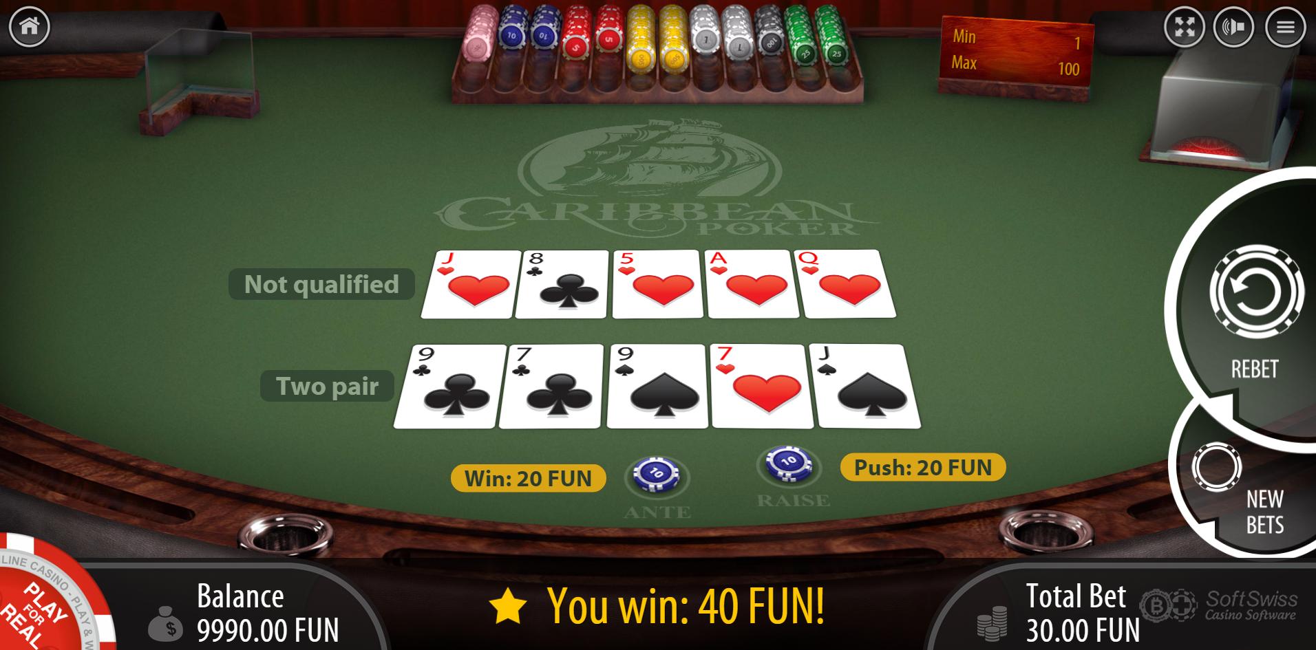 تُطلق شركة SOFTSWISS على لعبتها " بوكر الكاريبي " اسم "بوكر الكاريبي". تعتمد الشركة على جدول ربح قياسي (1، 2، 3، 4، 5، 7، 20، 50، 100)، مع هامش ربح للكازينو بنسبة 5.22%.