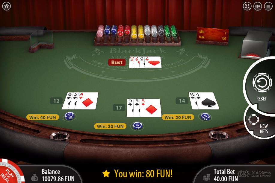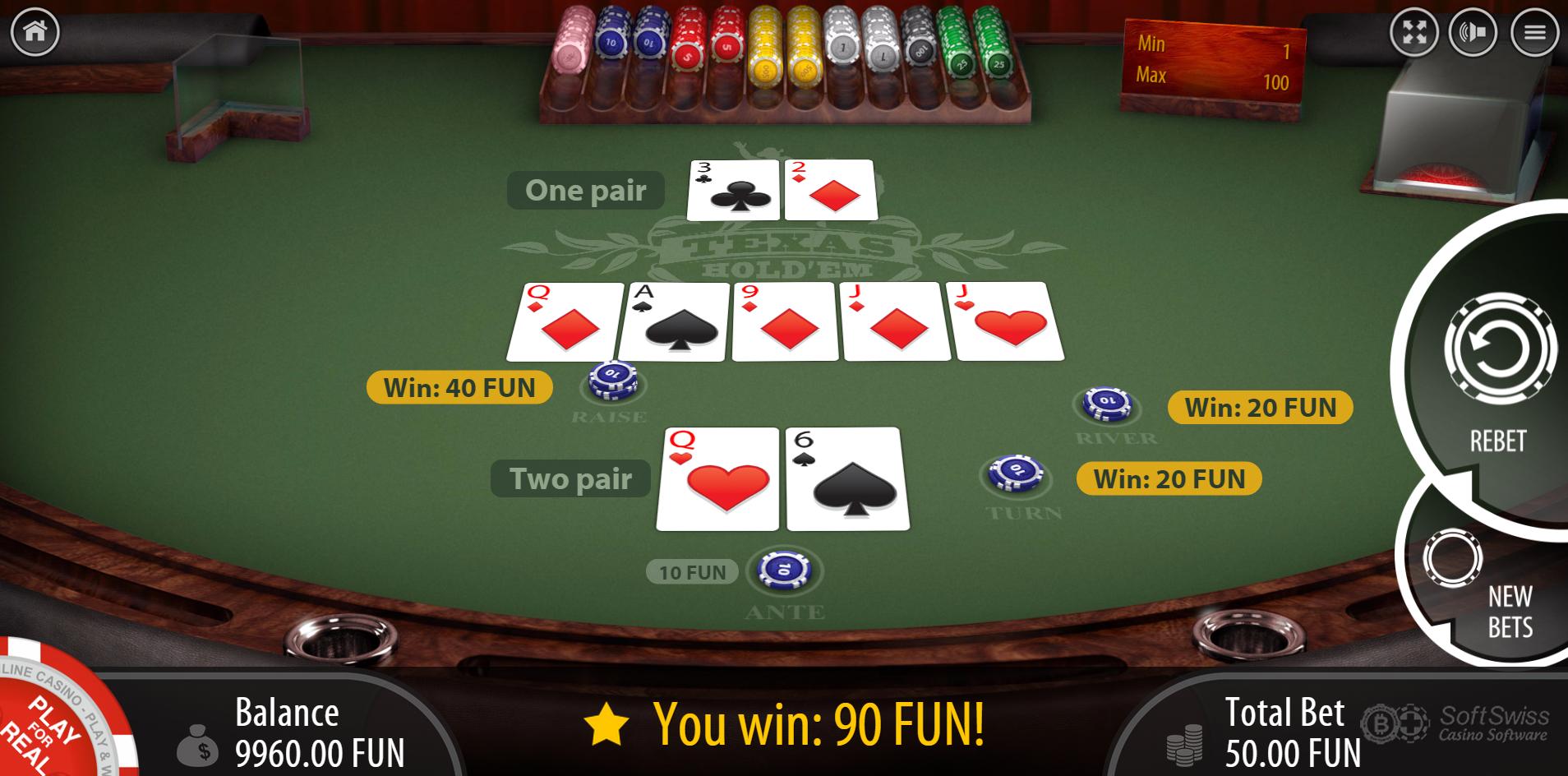 تتبع SOFTSWISS قواعد لاس فيغاس الليبرالية الخاصة بـ Texas Hold 'Em Bonus ، حيث يتم دفع الرهان الأولي على التوالي أو أفضل، للحصول على ميزة منزلية تبلغ 2.04%.