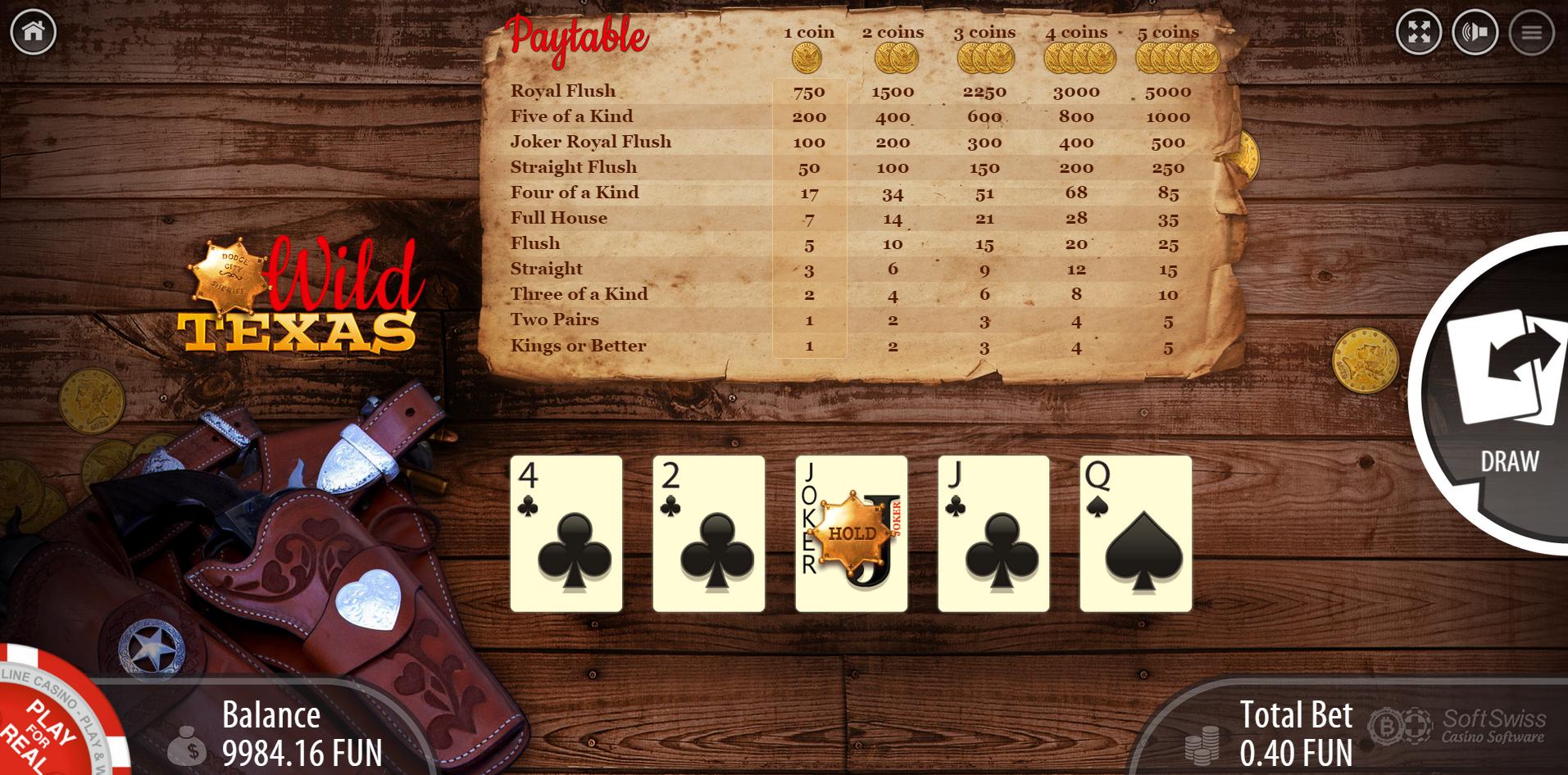 هناك لعبتا فيديو بوكر فقط: Jacks or Better وJoker Poker. يُعرف Joker Poker باسم Japan Dream وWild Texas. لم أتمكن من تشغيل Japan Dream أثناء كتابة هذه المراجعة، لكنني تمكنت من رؤية جدول الدفع، وهو مطابق لجدول الدفع في Wild Texas.