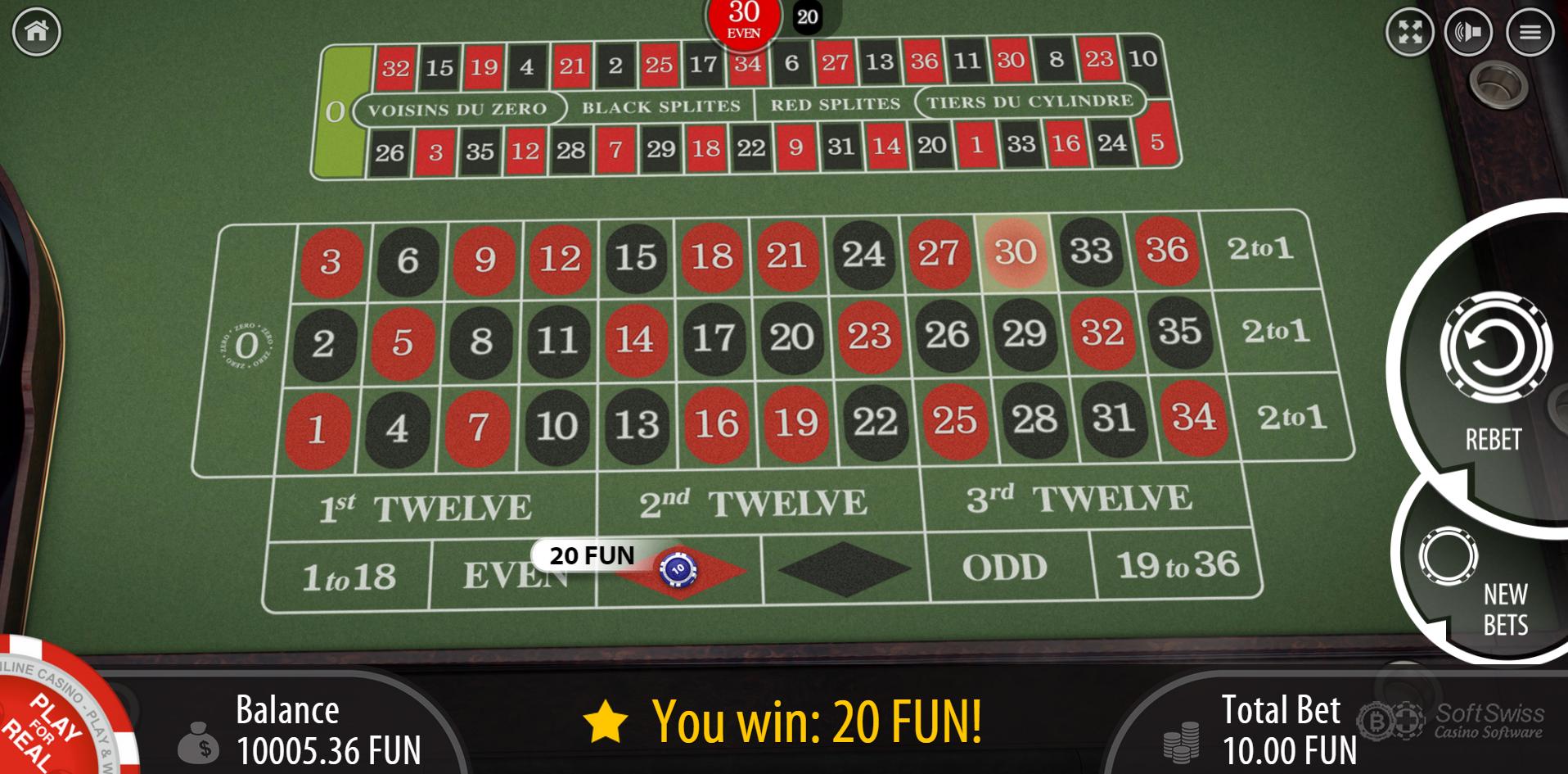 تتبع SOFTSWISS جدول ربح Let it Ride المعتاد 1،2،3،4،5،8،11،20،200،1000، بنسبة ربح للكازينو تبلغ 3.51%. يوجد أيضًا رهان جانبي يتبع جدول ربح 6،9،25،50،75،100،2000،20000، والذي أقدر أن نسبة ربحه للكازينو تبلغ 6.14%.