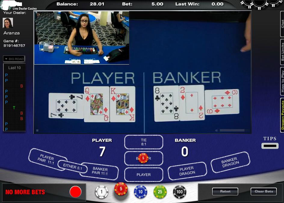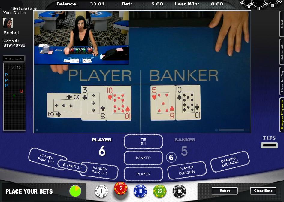 - لاعب التنين : يُطلق على هذا الرهان الجانبي عادةً اسم مكافأة التنين في الكازينوهات التقليدية. يُدفع إذا فاز اللاعب بفارق فوز طبيعي أو بفارق أربع نقاط على الأقل. أشرح التفاصيل في صفحتي الخاصة بالرهانات الجانبية للباكارات . تبلغ نسبة ربح الكازينو في لاعب التنين ٢٫٦٥٪.